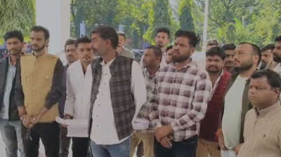सागर: करणी सैनिकों ने एसपी कार्यालय के बाहर कीर्तन कर जताया विरोध