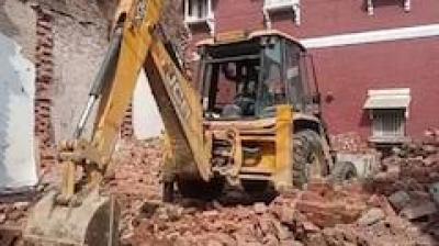 बुलडोजर और मजदूरों की टीम ने संभाली कमान, लगातार गिर रहे भवन